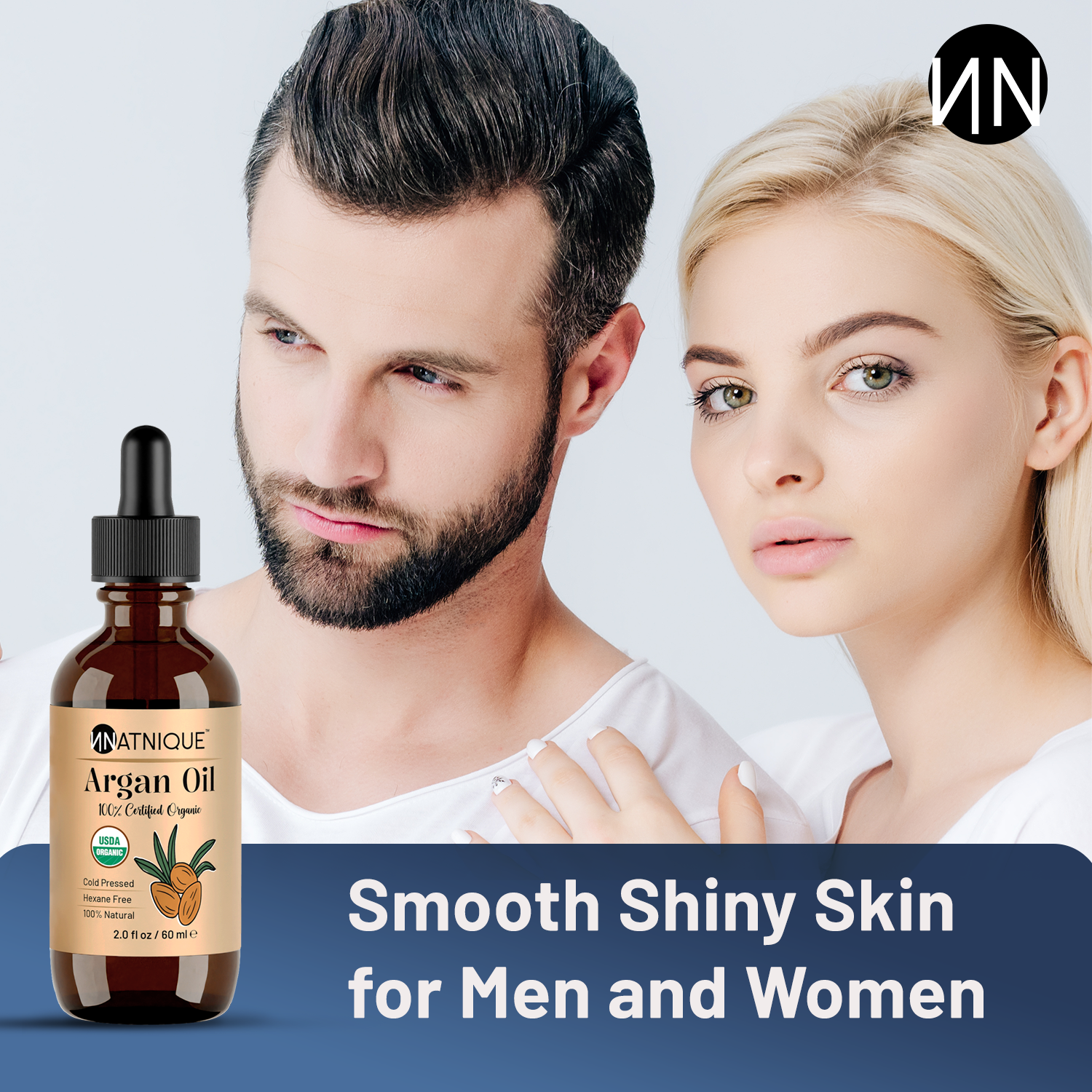 SOFT SHINY SMOOTH SKIN FOR MEN AND WOMEN – Natnique’s Argan oil for skin can be used as a daily moisturizer. It is non-greasy, light and has no smell. Add it to your daily skincare routine to help reduce the appearance of pimples, acne scars, blemishes, wrinkles, and fine lines.