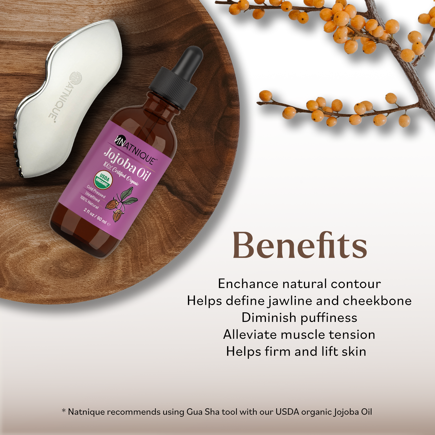 SELF-COOLING: Natnique’s gua sha tool is made from a completely self-cooling material. There is no need to put it in the freezer to cool, use it directly with your choice of massage oil. Natnique recommends our USDA organic Jojoba oil to use with our gua sha tool.